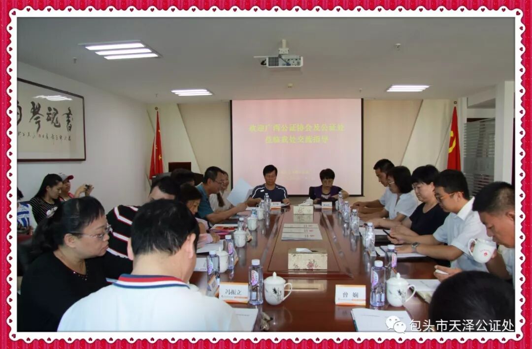 2018年8月23日上午,广西公证协会会长何月娟及公证处同仁一行17人在包头市昆都仑区司法局基层科科长孙淑敏、律公科副科长张俊青的陪同下莅临包头市天泽公证处交流指导。