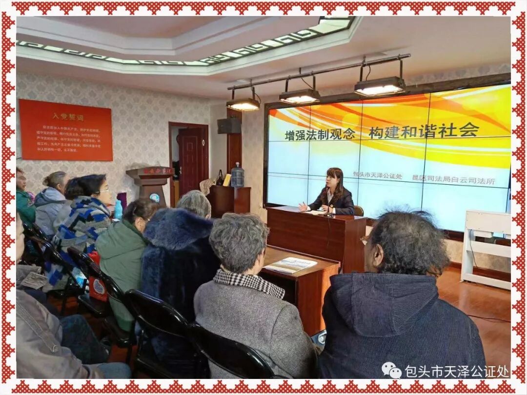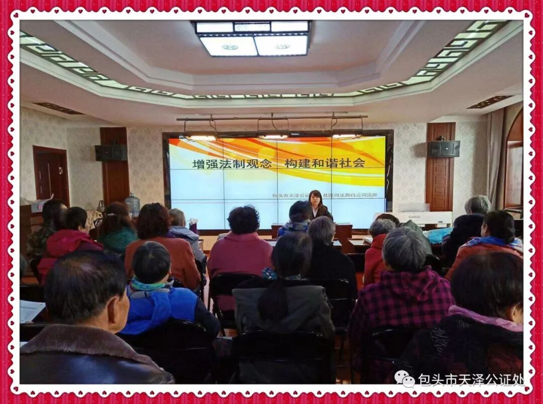 为了普及法律知识,维护社区居民的合法权益,满足社区居民对法律服务的需求,促进和谐家庭、和谐社区、和谐社会的建设,2018年11月15日,包头市天泽公证处业务三部公证人员周玲为包头市昆都仑区白云路街道办事处的居民们送上了一堂生动的法制讲座,受到社区居民的热烈欢迎。讲座上,公证人员周玲围绕《中华人民共和国婚姻法》、《中华人民共和国继承法》、《中华人民共和国物权法》,通过大量生动的案例、简练幽默的语言详细的介绍了权益保护、家庭财产、婚姻等相关内容。讲解结束后周玲就居民们关心的家庭财产分割、遗产继承、房屋买卖等可能产生的纠纷等公证、法律问题,进行了现场解答,并赠送了我处的自编普法宣传刊物《天泽公证》和水杯等小礼品。居民们纷纷表示:希望天泽公证处能够将送法进社区常态化,让居民们牢固树立法律意识,掌握依法维权的本领。