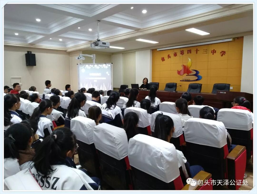 为进一步提高青少年宪法意识,使宪法精神深入人心,更好的维护和实现青少年的合法权益,营造青少年健康成长的良好环境,在“12·4”第五个国家宪法日暨首个国家“宪法宣传周”到来之际,2018年12月4日,包头市天泽公证处业务三部公证人员陈默受包头市第四十三中的邀请,为初二年级学生带来了一堂主题为“年轻的我们--未成年人的自我保护及预防犯罪”的法制讲座。