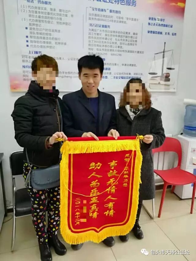 在公证路上包头市天泽公证处公证人员始终坚持把当事人的利益放在第一位,积极主动为当事人解决各种难题,认真践行“服务于民 执法为民”的服务宗旨。那面印有“事故无情人有情,助人为乐显真情”的锦旗不仅是对我处优质耐心服务的肯定,更是对全体天泽人的鞭策和激励,天泽公证人将把荣誉化作前行的动力,让法律的阳光播散到需要的地方,普惠更多社会大众!