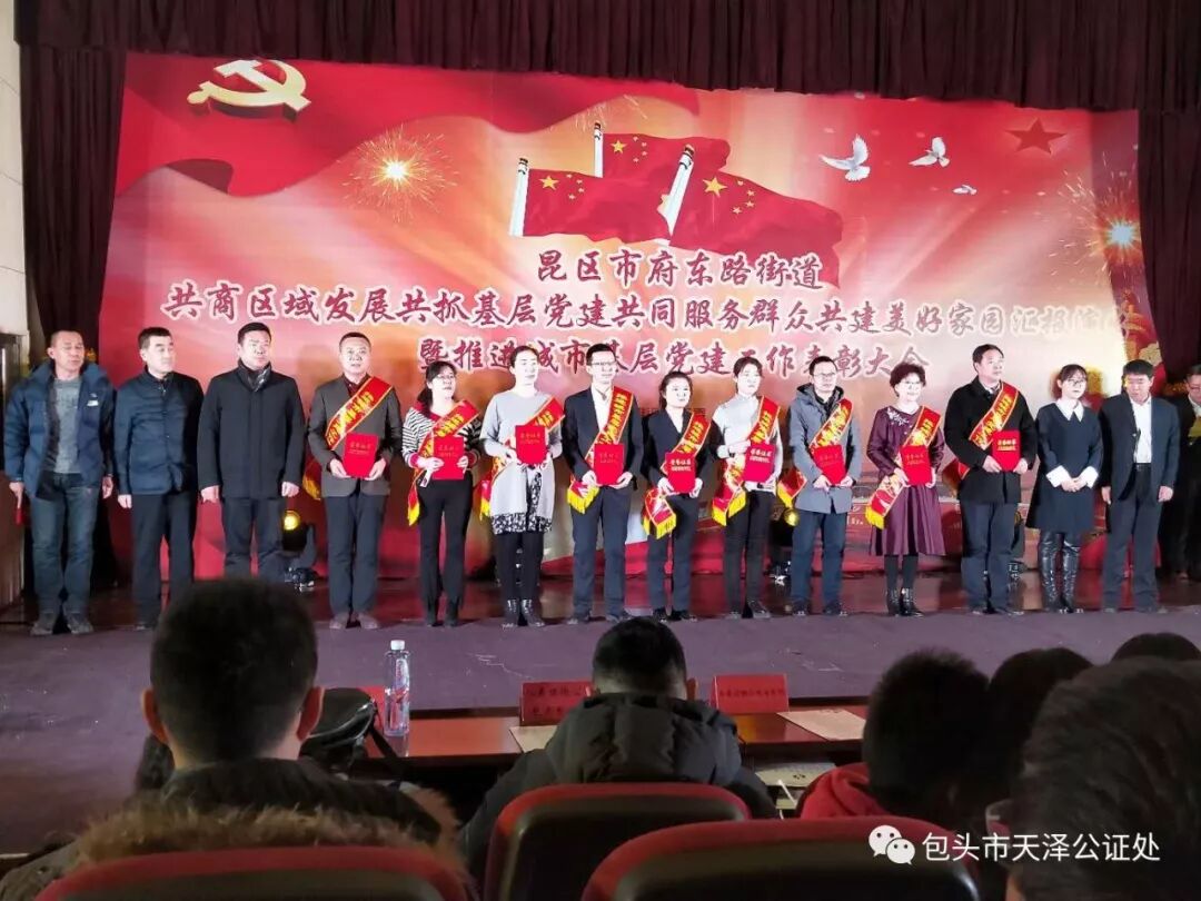 包头市天泽公证处家事法律服务室继获得昆北街道海威社区居委会“优秀共建单位”荣誉称号后,2019年1月18日,应锡华社区居委会邀请,参加了昆区市府东路街道党工委、市府东路街道办事处主办的“共商区域发展 共抓基层党建 共同服务群众 共建美好家园汇报演出暨推进城市基层党建工作表彰大会”。