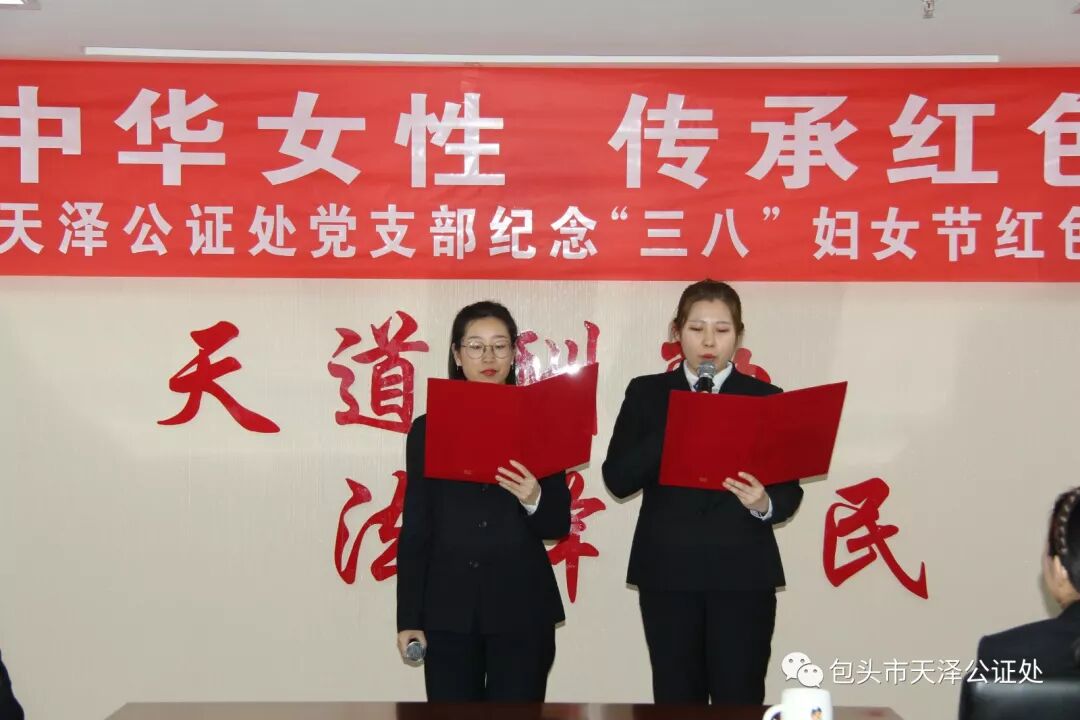 诵读会上,15名女职工走上台铿锵有力,声情并茂地诵读了红色经典诗词。业务一部王静、苏泽琪朗读的《热爱生命》,引发了大家对生命的深刻思考;业务二部薛晓花、张庆辉朗读的《可爱的中国》慷慨激昂,激发了大家的爱国热情;业务三部陈佳敏、周怡霏带来的《都活成自己想要的样子》寓意美好,愿每个人都活成自己想要的样子;党员高宏朗读的《母亲是一种岁月》让我们触摸心扉,怀想母亲的绵绵柔情;创新研究发展部周玲、李卓诵读的《平凡中的伟大》歌颂了女性的伟大;家事法律服务室柳惠带来的《出水芙蓉》描绘了女性的唯美,缠绵悱恻;业务保障部李晶、左广薇诵读的《从三月里款款走来的女子》描摹了女性的优美、端庄、典雅;行政事务部冯雪梅、郭雅芳朗诵的《党旗赞》表达了每一位中国人对党旗的赞颂。最后,包头市天泽公证处党支部书记、主任李琨带来的《一个人要像一支队伍》感情真挚,鼓励每位女性要具备优秀的品质:不气馁,有召唤,爱自由。主任李琨的诵读将本次活动推向了高潮。现场优美的配乐、恰到好处的语感、和谐优美的体态语言给大家呈现了一场视听盛宴,更是天泽人爱党爱国的精彩演绎。 大家纷纷表示本次活动形式新颖,诵读内容催人奋进,让人切身感受到了信仰的力量,传承了红色基因,受到了一次生动而深刻的党性教育,提振了在新时代展现新担当新作为的精气神。 巾帼向党心,传承经典情。今后,包头市天泽公证处党支部将以红色经典诵读活动为契机,不断创新学习形式,激发广大女职工的爱党爱国热情,不忘初心,继续奋斗,为实现“天泽速度”贡献自己的青春和活力!