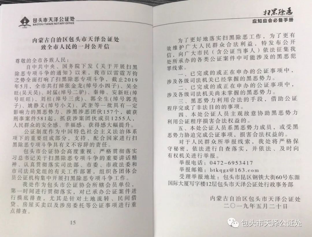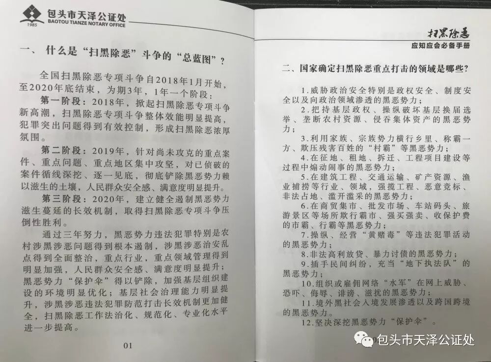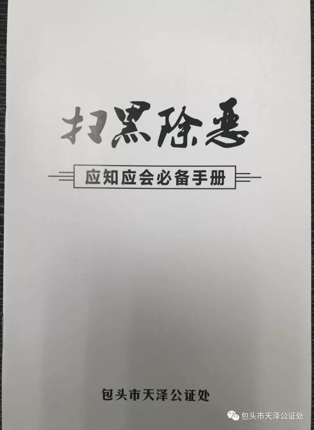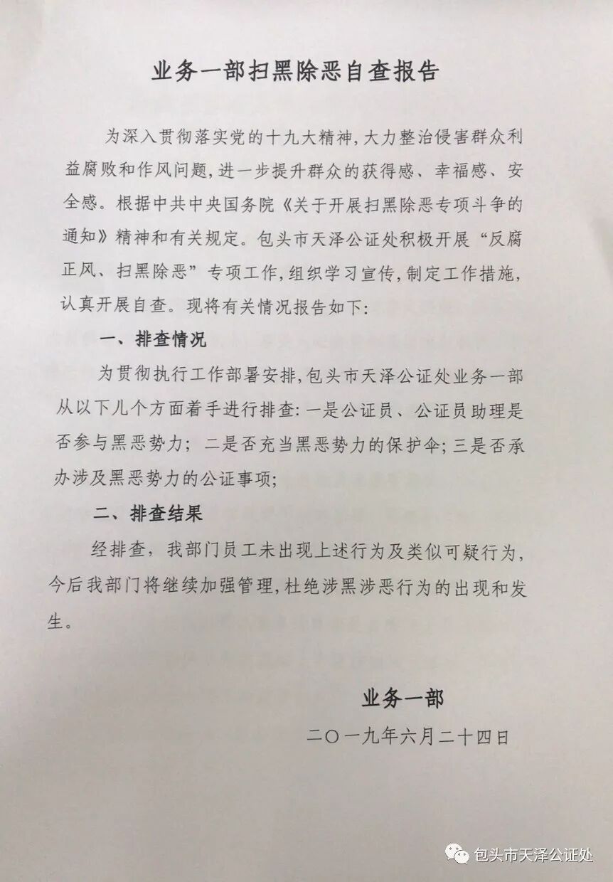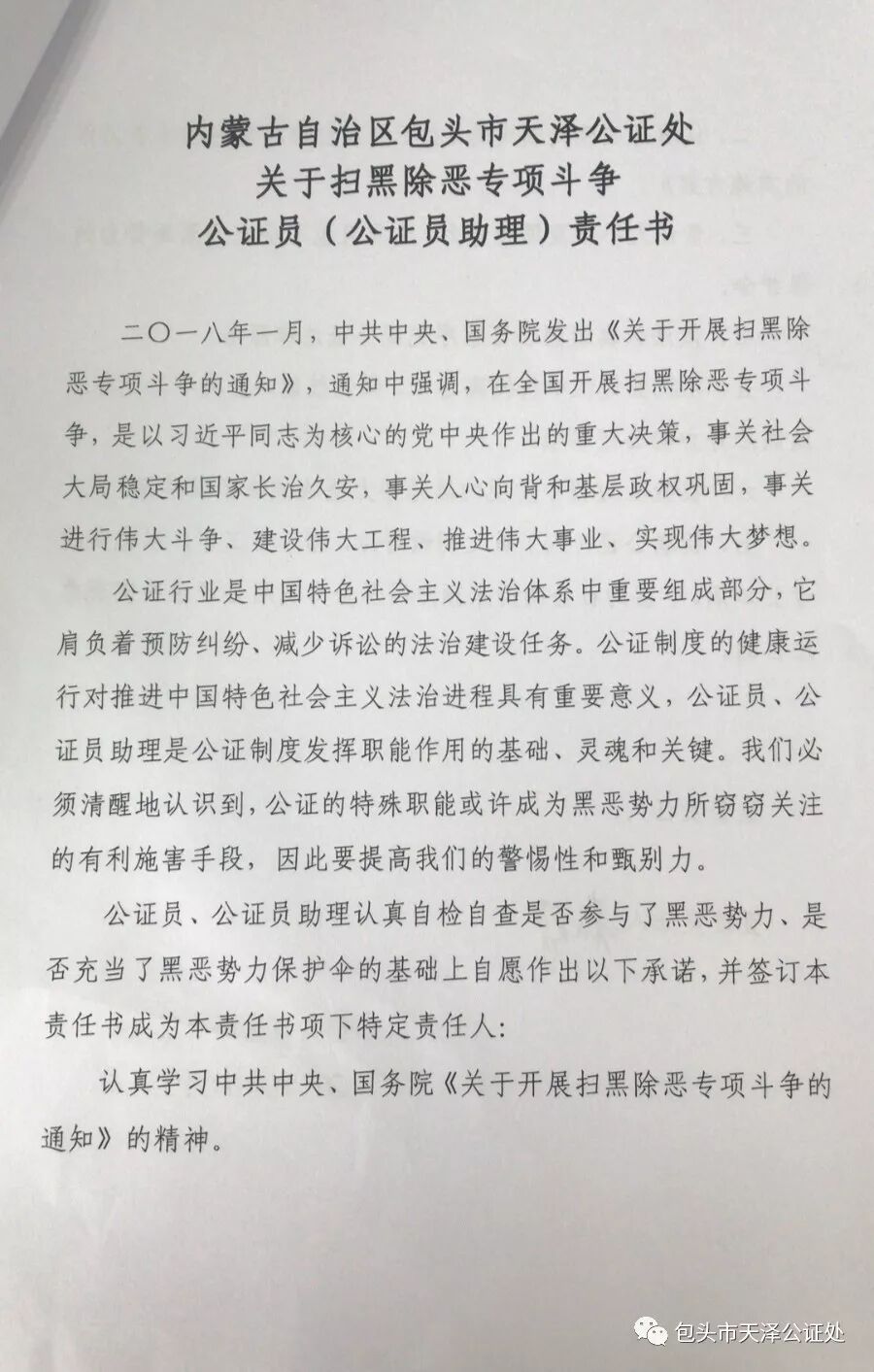 开展扫黑除恶专项斗争,是以习近平同志为核心的党中央作出的重大决策,事关社会大局稳定和国家长治久安。自2019年5月16日《包头市天泽公证处关于开展扫黑除恶专项斗争工作的实施方案》文件下发以来,我处各部门严格落实文件精神,明确治理目标和工作重点,强化工作措施和责任落实,扎扎实实开展好扫黑除恶专项斗争。