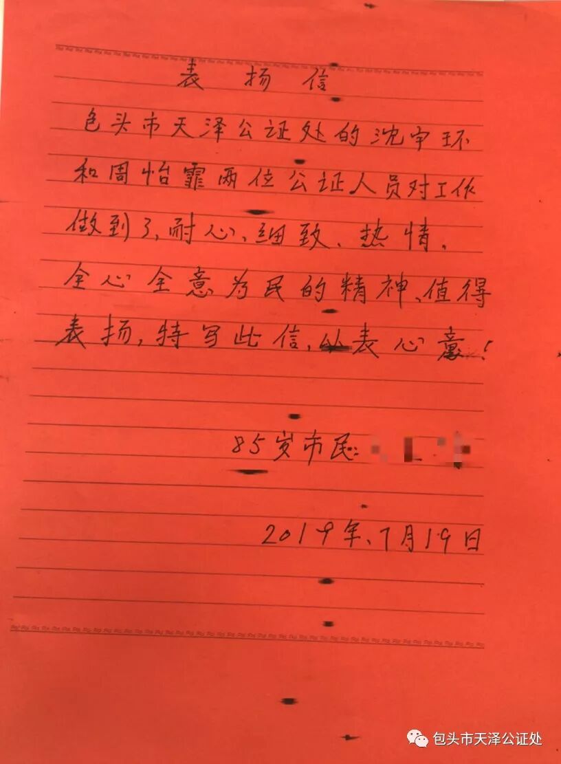 王奶奶送来感谢信 85岁的王奶奶考虑到自己年纪越来越大,想在神志清晰时对财产进行妥善处置,为此向我处申办遗嘱公证。受理公证后,公证员沈宇环、公证员助理周怡霏将老人搀扶进“绿色工作室”。绿色工作室安静舒适的环境让老人不再避讳,敞开心扉,将自己的苦楚和意愿倾泻而出,公证员根据老人的真实意愿代拟温情遗嘱,并用工作室内的录音录像采集系统将现场数据同步上传,在老人面前现场封存遗嘱光盘,确保整个遗嘱公证过程的真实、客观。事后,王奶奶送来一封感谢信,感谢我处解决了她这么多年的心理困扰,而且对我处绿色工作室的温馨体验赞赏有加。 温馨、舒适的“绿色工作室” “绿色”代表的是:自然、环保、宁静、希望。我处打造“绿色工作室”目的就是为市民群众提供温馨的服务体验场所,室内配备养生、烹饪、种植等书籍,放置沙发、甜点,安装高清数字化影像采集、声音识别同步设备。当申请人在开放的办证大厅不方便表达自己的真实意愿;当申请人遇到网络侵权行为,需在私密空间进行录音、录像将证据锁定;当申请人遭遇离婚变故,需处置财产和明确孩子的抚养权问题时;当申请人申办人身伤害赔偿公证需排除外界干扰时;当公证员对重要证人核实,需将证人与公证事项申请人分离,以探求、评判证据效力确保公证质量时;当老年人、残障人士、退役军人和现役军人等特殊人群申办公证时;当公证员出具执行证书向债务人核实债务履行事实时,绿色工作室成为解决上述问题的首选场所。 包头市天泽公证处“绿色工作室”的设立,不仅高度契合国家提出为社会提供普惠均等、便捷高效、智能精准的公证法律服务,还提升了公证事项申请人的安全感和被保护意识的感受。天泽人坚持用有热情、有温度、人性化、专业化的绿色服务,让“绿色工作室”成为传递情感和法律正义并举的便民平台,不断提高人民群众的获得感、幸福感、安全感。