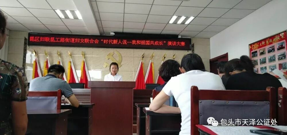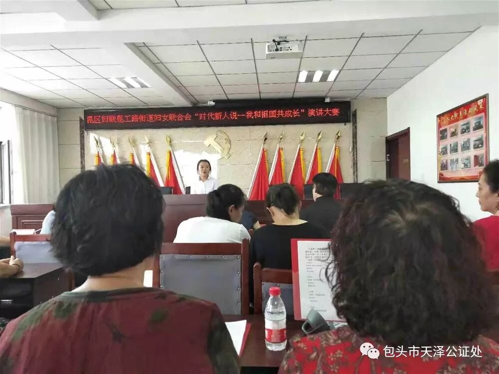 70年的巨变沧海桑田,70年的征程波澜壮阔。在迎接伟大祖国70周年华诞的喜庆日子里,2019年7月19日, 包头市昆工路街道办事处联合包头市昆区妇女联合会共同举办了“时代新人说——我和祖国共成长”演讲大赛,共叙成长之喜,共抒爱国之情。包头市天泽公证处家事法律服务室工作人员代表西友谊22社区参加了此次演讲比赛。
