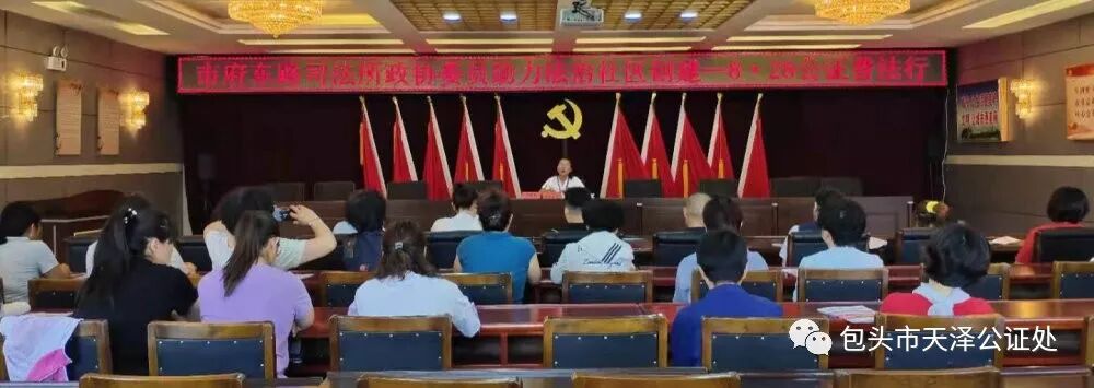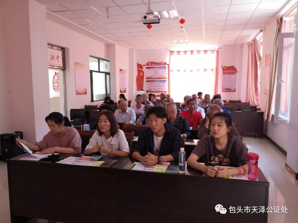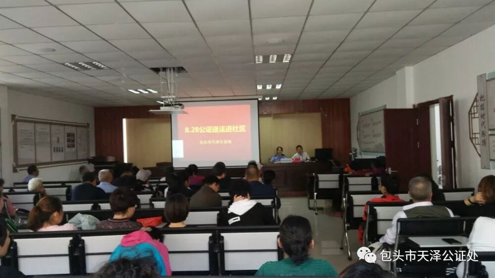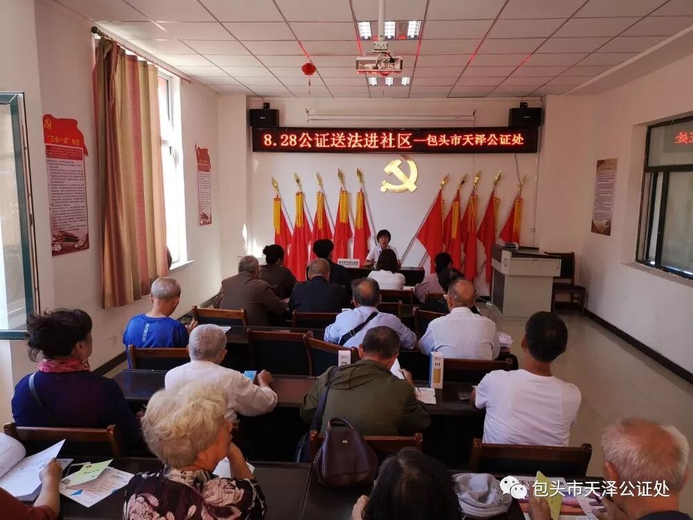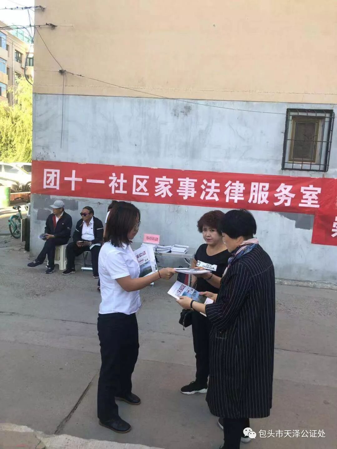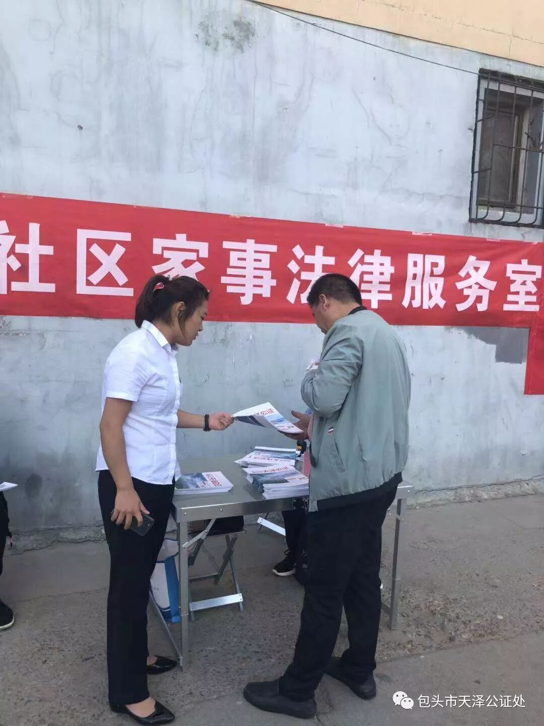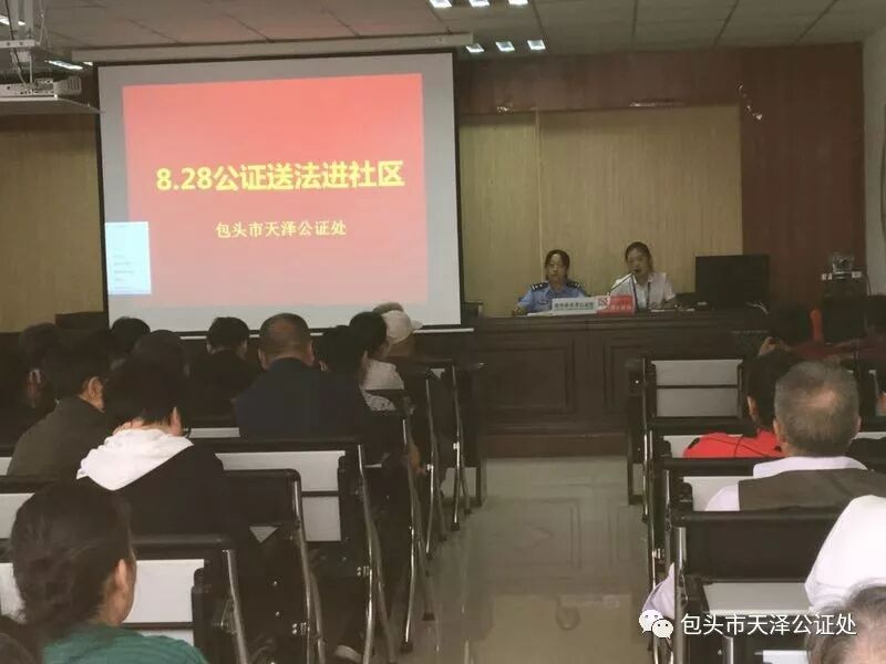 为弘扬法治理念,普及公证知识,在《中华人民共和国公证法》颁布十四周年之际,2019年8月28日,包头市天泽公证处公证人员分别走进包头市昆区东友谊22社区、广恩社区、青年路七号街坊、市府东路街道办事处和团十一社区,为社区居民奉上了生动的普法大餐。