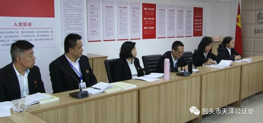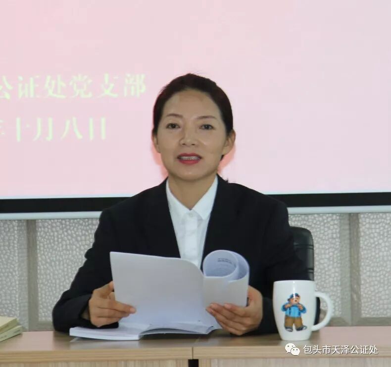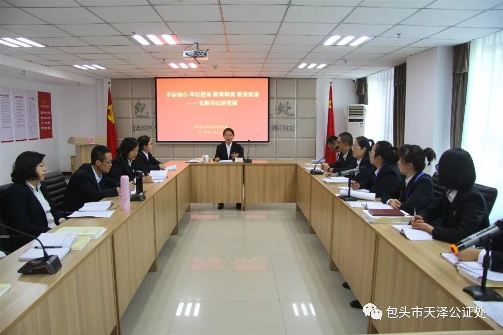 为庆祝中华人民共和国成立70周年,深入学习贯彻习近平新时代中国特色社会主义思想,推进“不忘初心、牢记使命”主题教育深入开展,激励广大党员坚定理想信念,增强党性意识,改进作风,不断提高党组织的创造力、凝聚力和战斗力,2019年10月8日下午,包头市天泽公证处党支部开展了“不忘初心、牢记使命”党支部书记讲党课活动。