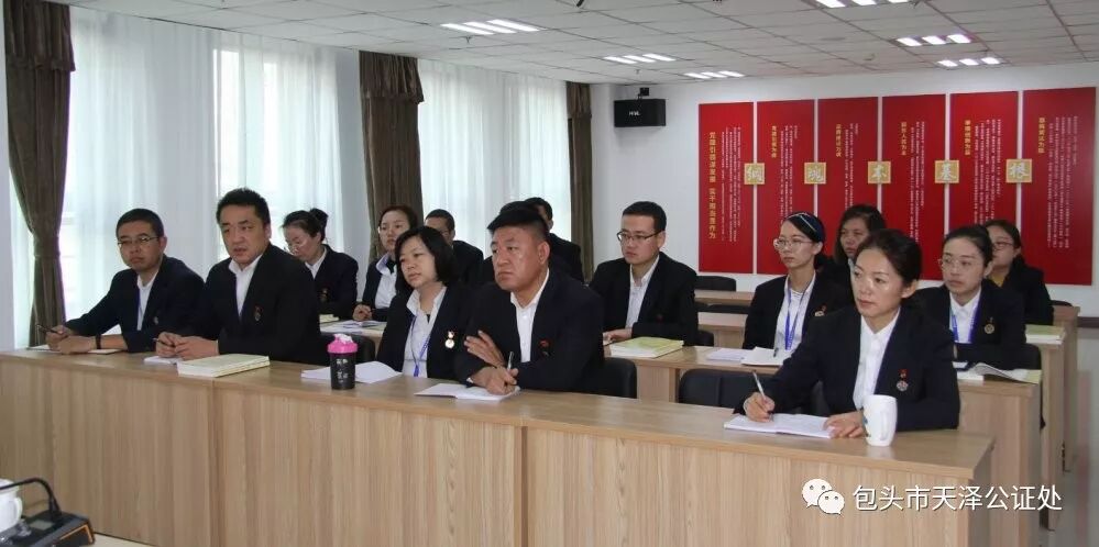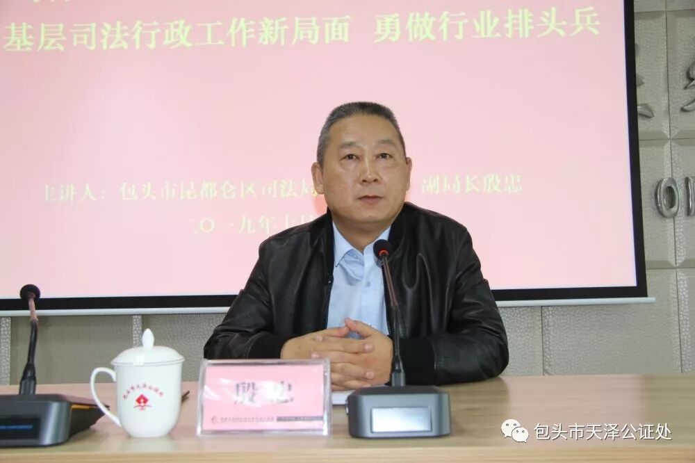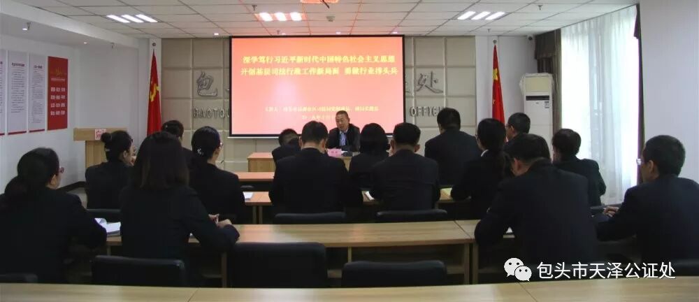 2019年10月18日下午,包头市昆都仑区司法局党组成员、副局长殷忠以《深学笃行习近平新时代中国特色社会主义思想 开创基层司法行政工作新局面 勇做行业排头兵》为题,为包头市天泽公证处全体党员上了一堂主题鲜明、内涵深刻的专题党课。