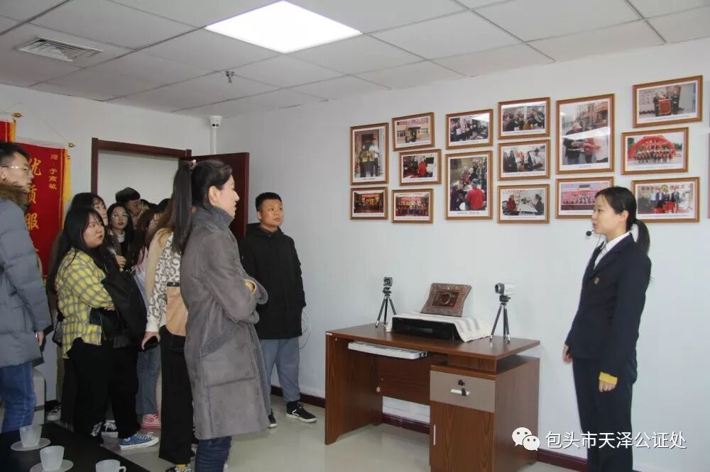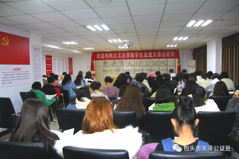 2019年11月14日,包头市天泽公证处迎来一群年轻人,110余名内蒙古科技大学文法学院18级法学专业学生走进包头市天泽公证处参观学习。早在2016年,包头市天泽公证处就与内蒙古科技大学文法学院建立了常年实习基地合作关系,一方面为在校学生提供实习机会,缓解学生的就业压力;另一方面,也是为公证行业储备人才,壮大公证队伍。