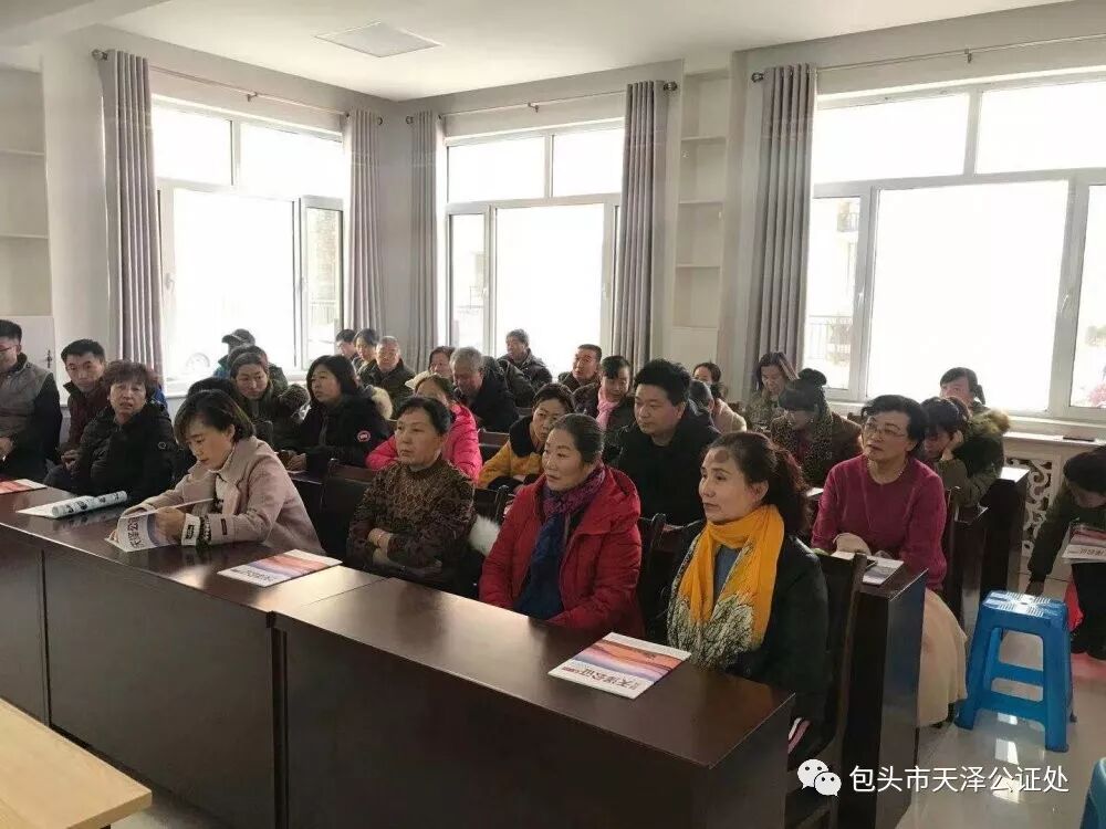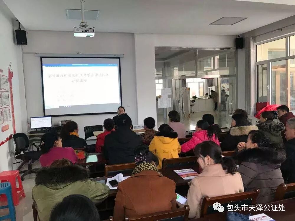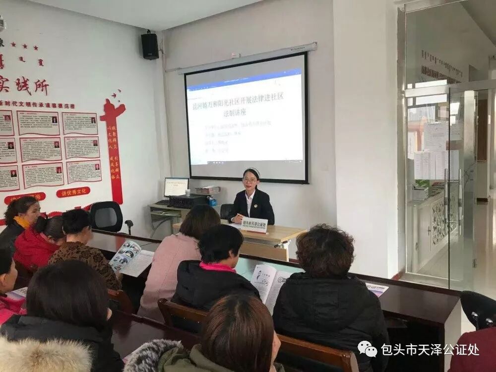 讲座以《婚姻法》《继承法》《民法总则》等相关法律法规展开。针对当前中国老龄化问题加剧的基本国情,公证员薛晓花重点对民法总则中规定的“意定监护”制度和遗嘱公证进行了详细的讲解,从意定监护的法律依据、意定监护的存在基础以及意定监护的具体流程,遗嘱的目的、方式和公证遗嘱的好处进行阐释,让在场人员明白在自身具备完全民事行为能力时,可提前安排身后事抑或让自己信任的人在自身失能失智后,给予帮助照管。在这过程中,公证都会提供强有力的法律支撑,意定监护公证、公证遗嘱将是最终的权益保障。为了让居民们听的更加明白,公证员薛晓花还介绍了我处承办的意定监护案例,居民们纷纷夸赞到:“意定监护真的太实用了,是一项利民的好举措。” 拍摄于 2019.11.28 一直以来,包头市天泽公证处坚持公益普法先行,每年度多次组织公证人员进社区、开讲座,既普及了公证法律知识,更是解决了困扰他们身边的疑难问题,顺应当下公证发展需求,传播最新公证法律知识,是天泽公证人义不容辞的责任。