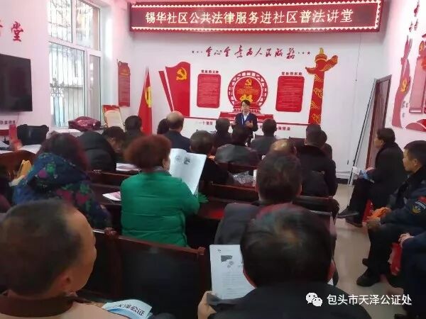 普法宣传进商铺 释法答疑解难题 2019年12月6日上午,包头市天泽公证处家事法律服务室工作人员在位于林荫路的华联超市门口开展了一场以“弘扬宪法精神,推进国家治理体系和治理能力现代化”为主题的普法宣传活动。虽然活动当天寒风凛冽,但是居民们的热情不减。工作人员刚悬挂上横幅,来往居民就将咨询台围得水泄不通,争先恐后索要我处的普法刊物《天泽公证》和《家事法律知识问答》。有的群众就房产处置方式、交易税费缴纳比例、遗产的处理、继承公证的办理手续和流程等与生活息息相关的法律问题进行咨询;有的居民对我处普法刊物表示出极大的赞赏,并提出多带几本给家里的亲戚阅读;还有的群众特意来询问我处的办公地点,家事法律服务室工作人员均详细予以解答、告知。活动中,家事法律服务室工作人员还走到周边商铺发放我处普法刊物,解答商铺人员的法律咨询。据统计,此次活动免费发放《天泽公证》300余册,《家事法律知识问答》50余册,咨询人数30余人次。 普法讲堂进社区 弘扬宪法零距离 2019年12月6日下午,锡华社区会议室内人头攒动、热闹非凡,一堂由我处家事法律服务室主任周玲带来的主题为“公共法律服务进社区”的普法讲座正在进行。两个小时的讲堂,掌声不断,社区居民纷纷表示“很满意!”“很有帮助!”本次讲堂一改法律艰涩繁复的通常风貌,转以讲故事、拉家常的方式,深入浅出地讲解了宪法的作用、地位和老年人最关心、最关注的意定监护、遗嘱、继承、财产处置以及在房产交易中如何保障自身养老问题等问题,得到了社区居民的交口称赞。讲解过程中,周玲还与在场居民互动,针对提出的法律问题答疑解惑,现场气氛十分活跃。此次普法讲座为社区居民免费发放我处普法刊物《天泽公证》100余册,解答咨询20人次。 弘扬法律,维护宪法权威是每一位法律人崇高的社会使命。包头市天泽公证处始终坚守普法惠民的初衷,定期开展普法宣传、普法讲座等活动,践行公证人光荣的使命。天行健,君子以自强不息,作为法律共同体的一员,天泽公证人将秉持初心,牢记使命,让法律的阳光泽被更多的社会大众,为推进国家治理体系和治理能力现代化贡献自己的力量。