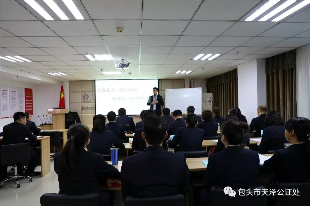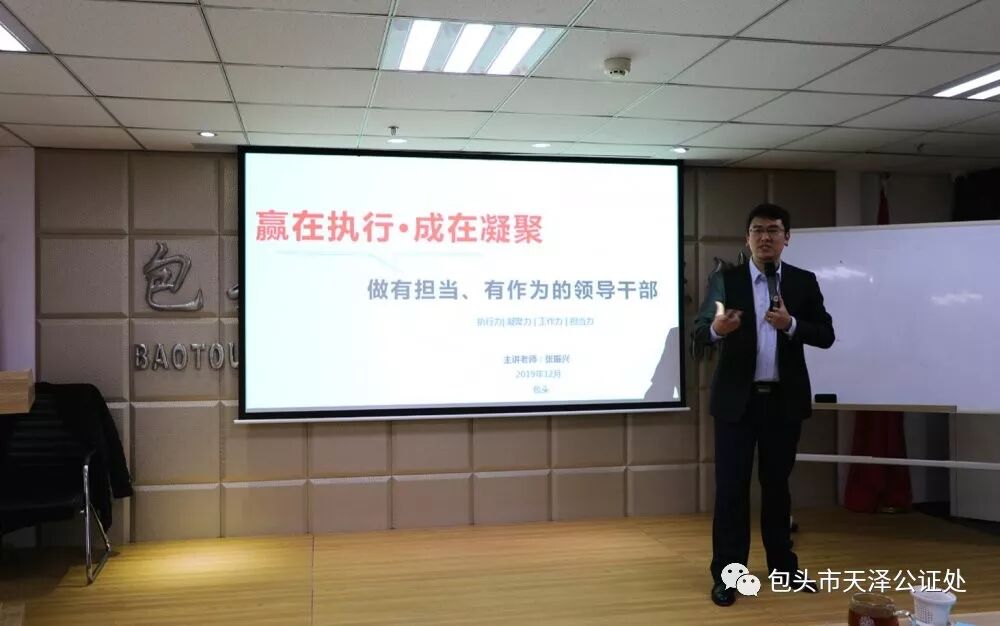 公证管理水平的提升关系公证事业的成败兴衰。为完善知识结构,增强处内人员的履职能力、决策能力、执行能力和创新意识,提升团队建设能力、管理能力与管理水平,适应新时代公证发展的需要,2019年12月14日,包头市天泽公证处开展了“赢在执行 成在凝聚”为主题的培训。