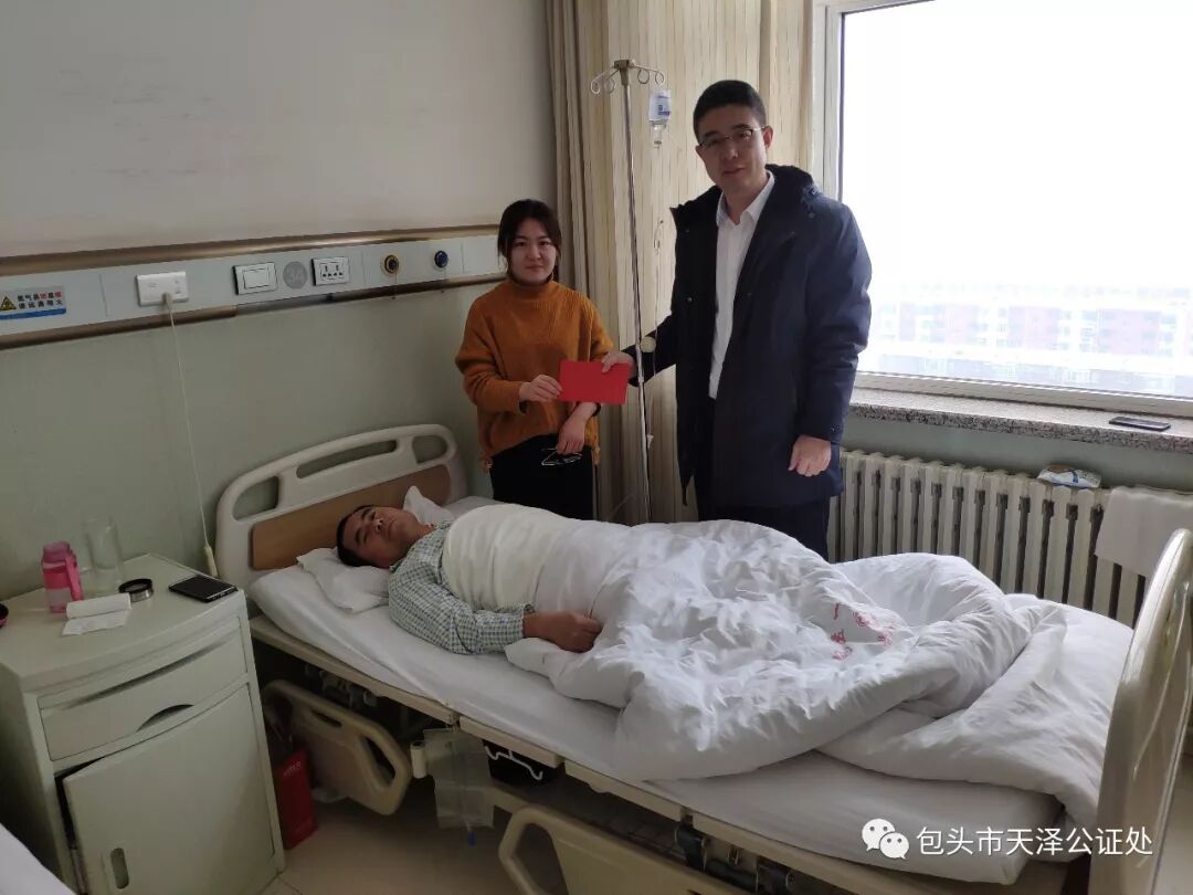 2020年1月17日上午,包头市天泽公证处天泽爱心基金管理委员会指派委员李光到包头市第一附属医院走访慰问患病职工柳惠家属,将5000元爱心基金送到她家人手中,鼓励他们树立战胜病魔和困难的信心。这是全处上下一致奉献爱心的体现,更是对团队凝聚力和向心力的一次考验,希望全处员工的爱心和关心能让柳惠一家感受到公证处带给她的无限温暖和坚定支持,筑牢他们家战胜病魔的顽强、坚韧、不屈的决心和防线。 点点爱心,汇聚成河,每个人的力量虽然微小,但滴水穿石,正能量的大爱终将化作阳光,汇成甘泉,创造奇迹。一人有困难,大家齐支援,此次爱心捐助,不仅为患病职工家属传递了一份生命的热度,点亮了他战胜病魔的信心和勇气,而且天泽人的关爱让他深切体会到天泽这个大家庭的温暖。