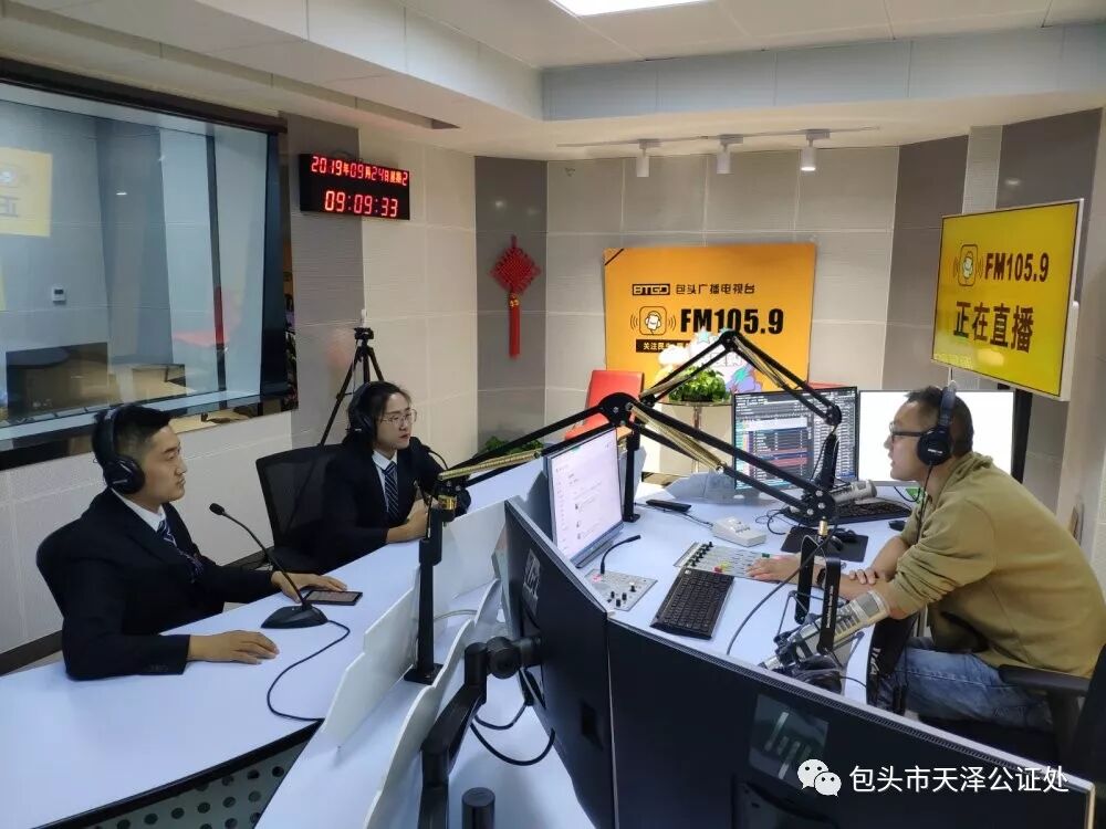 自2010年3月以来,包头市天泽公证处就与包头广播电视台开设的《第一房产》节目达成合意,坚持每周五指派公证人员做客该节目。通过现场互动、接听热线,让电波将普法的声音传遍我市大街小巷。十年来,始终坚守《第一房产》普法阵地,服务始终不曾间断。2020年2月7日是春节之后,我处公证人员做客该栏目的第一期节目,但在全国上下打响疫情防控阻击战的特殊时刻,虽不能像往常一样走进直播间答疑释惑,但公证服务不能缺位,我处公证员于燕敏用电话连线的方式在本期栏目耐心解答了听众关于婚前婚后财产的划分及归属、因疫情导致买卖双方违约如何承担责任等问题,为包头市民送去了驱散疫情阴霾的一道曙光。