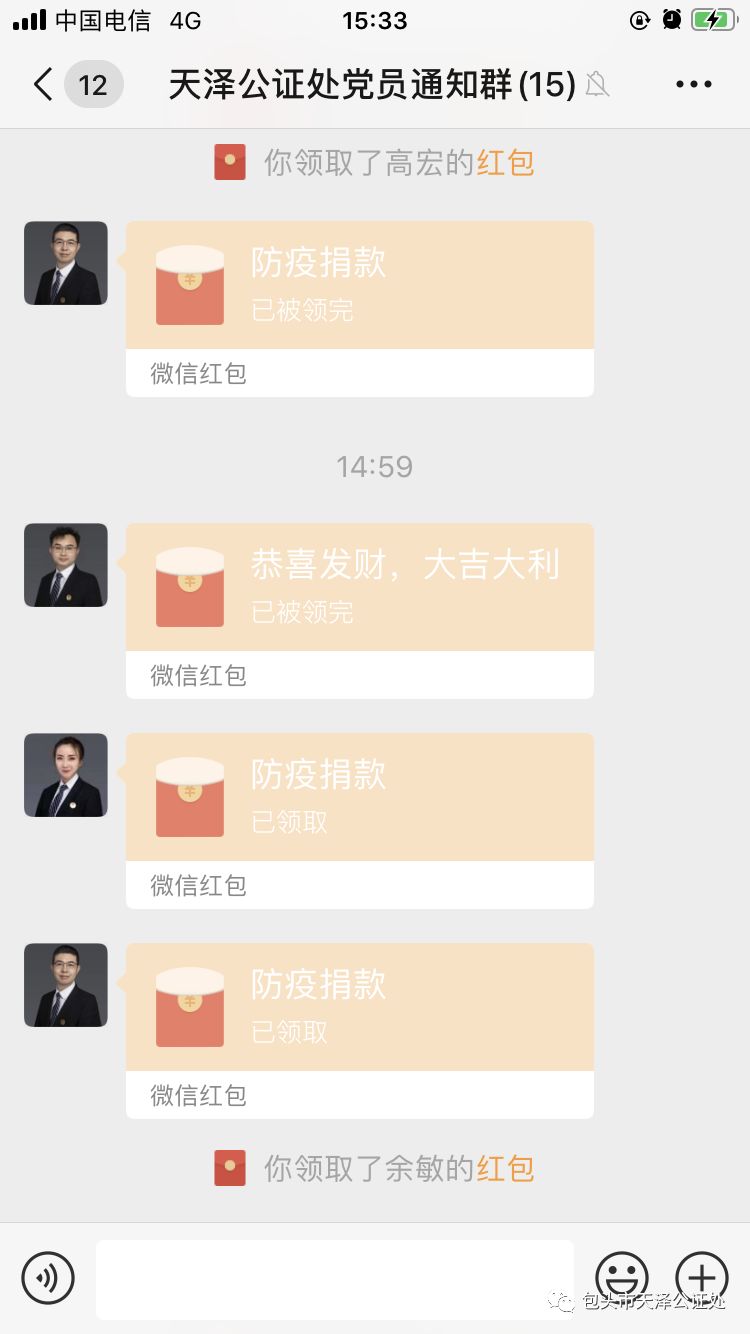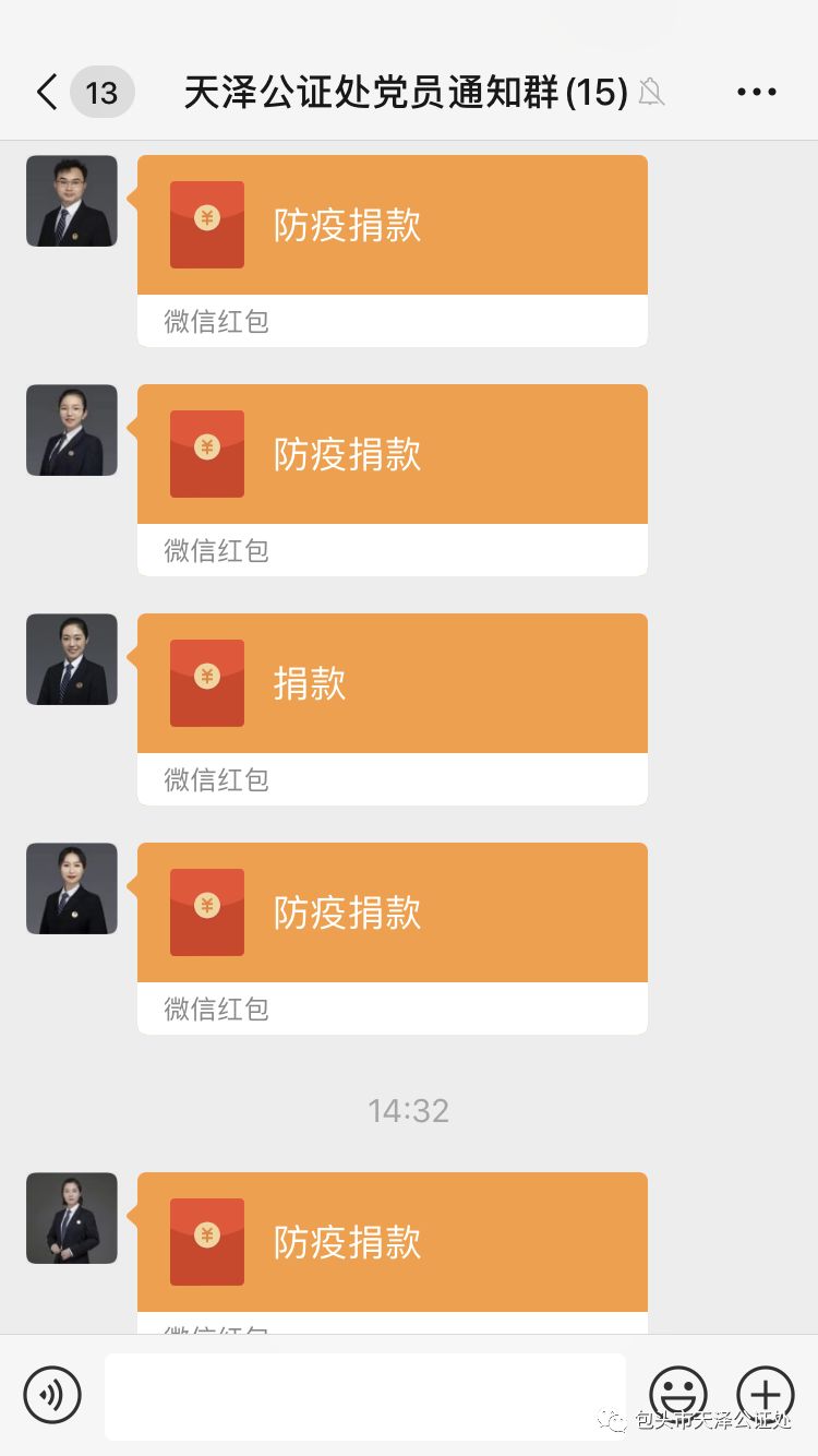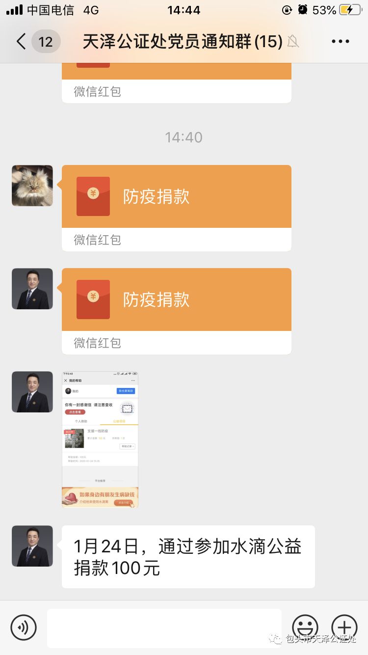 按照中共昆都仑区委组织部、昆区司法局党总支关于组织党员自愿捐款支持新冠肺炎疫情防控工作的通知要求,为有序组织好党员捐款工作,包头市天泽公证处党支部在党员通知微信群向全体党员发出捐款倡议。倡议一经发出,便得到支委成员及其他党员的积极响应,大家纷纷以微信转账的形式进行捐款。短短半个小时,15名党员共募捐1950元。这是继为包头市昆区红十字会、湖北公证同仁捐款6万元爱心基金后倡议的第三次捐款。全体党员用实际行动践行初心使命,支持疫情防控工作。 众志成城 万众一心 这既是一场强信心、暖人心、聚民心的“全党行动”,又是一次心手相连、守望相助、共同抗疫的“全民行动”。共产党员迎难而上,党旗高高飘扬,包头市天泽公证处全体党员始终站在抗击疫情的最前沿,以冲锋者的姿态、先行者的身份,承担社会责任,做好公证服务,充分发挥战斗堡垒和先锋模范作用。