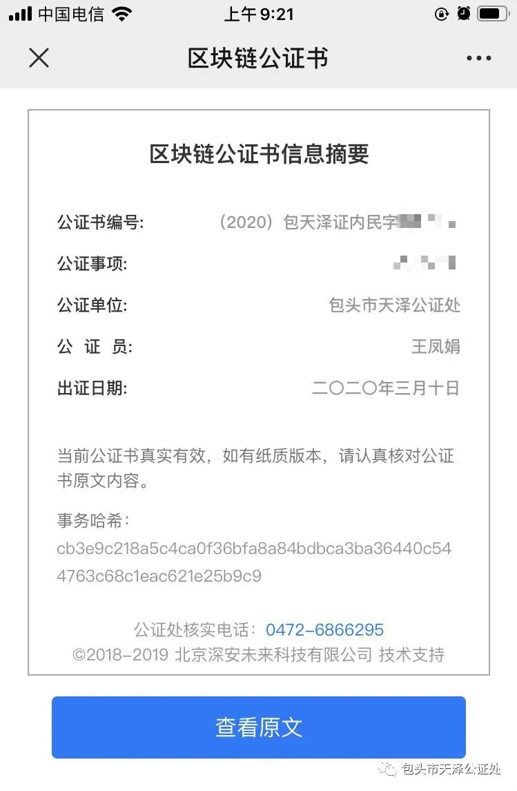“区块链公证书方便、快捷,通过手机扫描即可快速获取电子公证书,而且能有效降低造假风险,真的太实用、太便捷了!”当事人王某高兴地说。2020年3月10日,当事人王某在包头市天泽公证处领取了内蒙古自治区首份区块链公证书,这对内蒙古自治区区块链公证服务具有重要意义,有效打通了服务群众“最后一公里”。